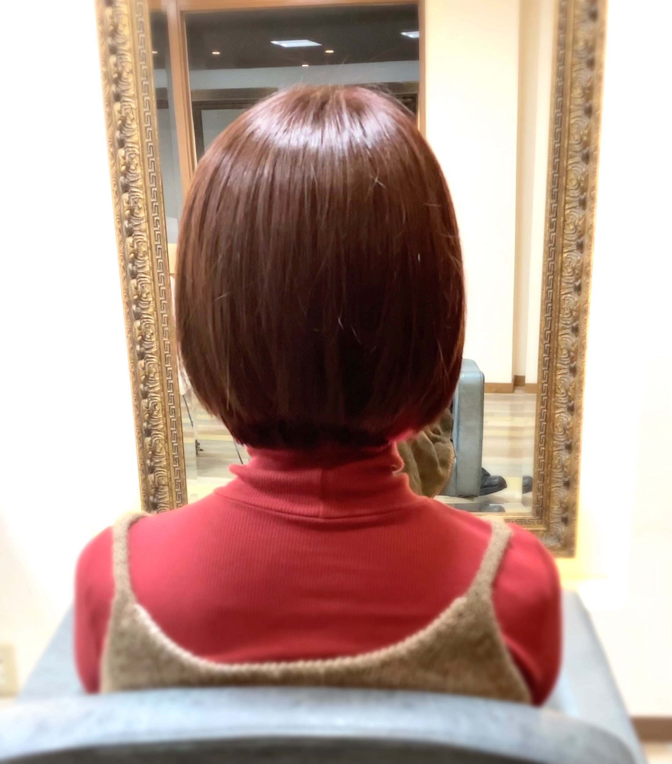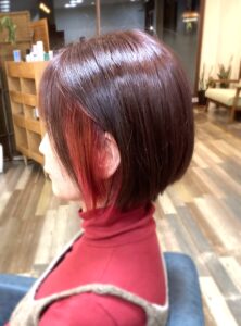サイドにブリーチカラーをしてから、パンチの効いたレッドを単発でオンしています。
